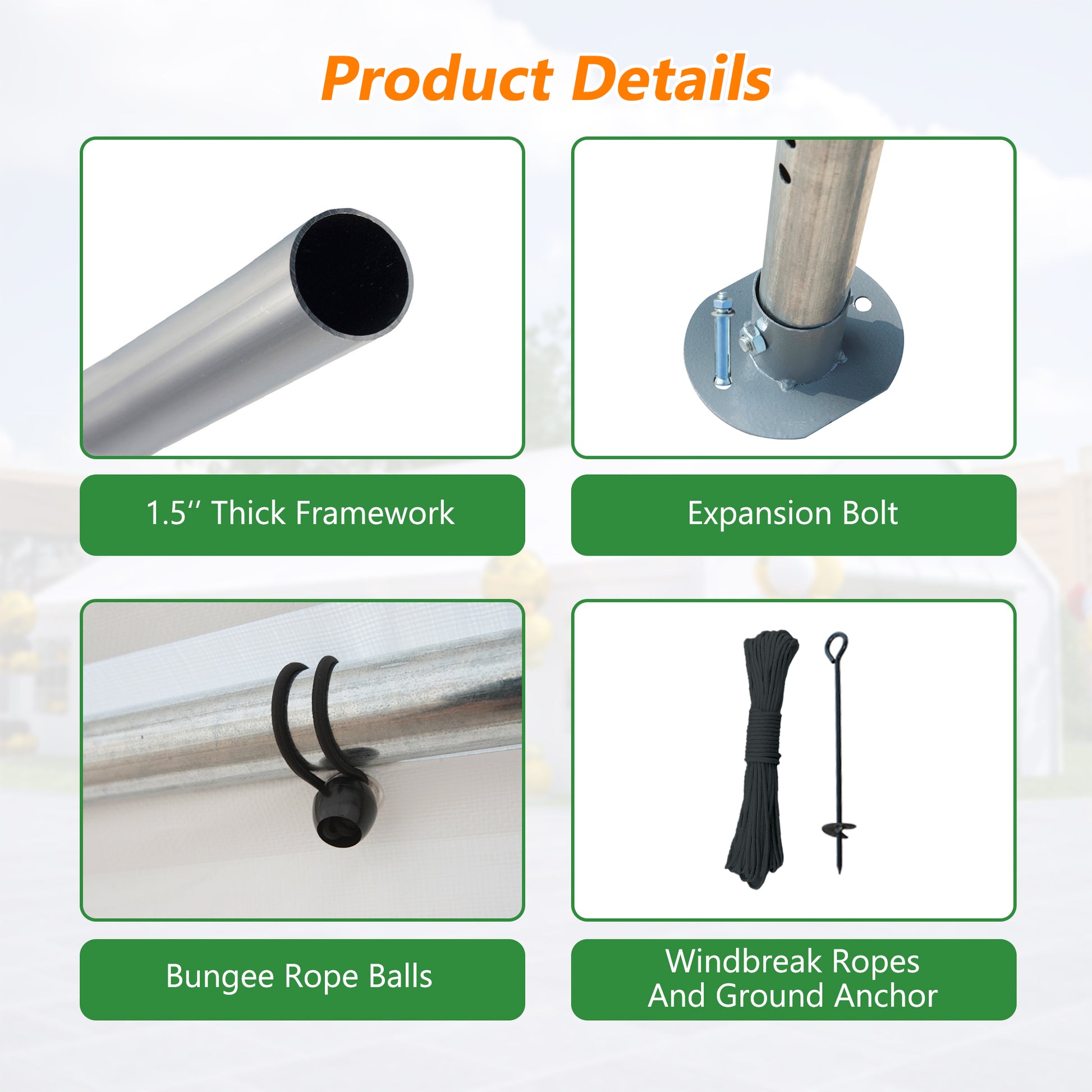 - The party tent frame is made of high-quality materials, rust-proof and corrosion-resistant, and can provide strong support. The tarpaulin uses high-quality PE fabric, which is waterproof and UV-resistant.