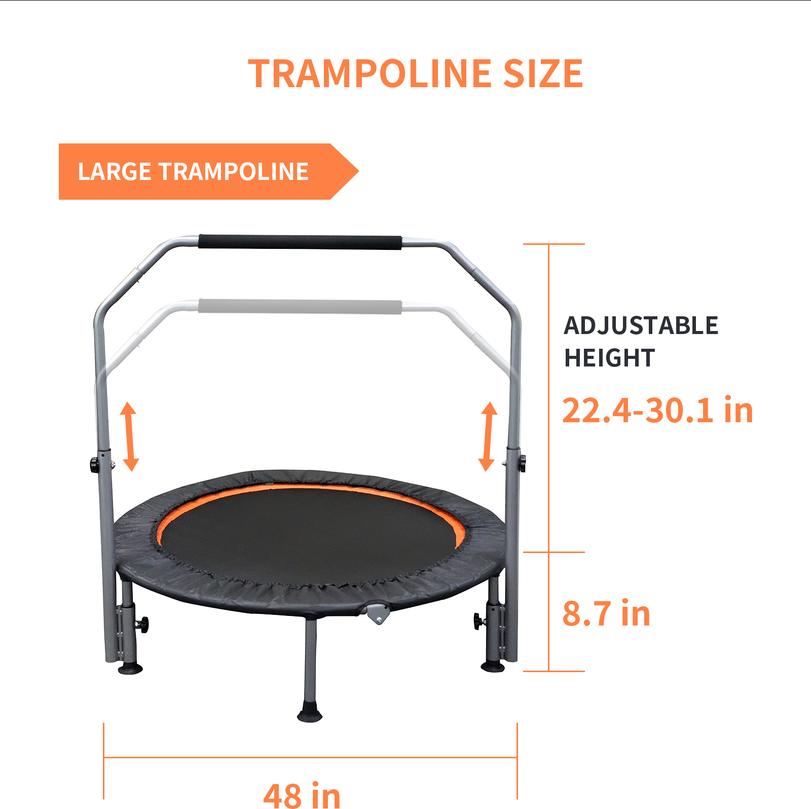 Padded Handle Bar: Rebounder trampoline for adults fitness is adjustable to fit different height.The mini trampoline handle is covered by the foam material for easy grip to control your bounce and prevent accidentally fall down,comfortable, stable and safe for users.
