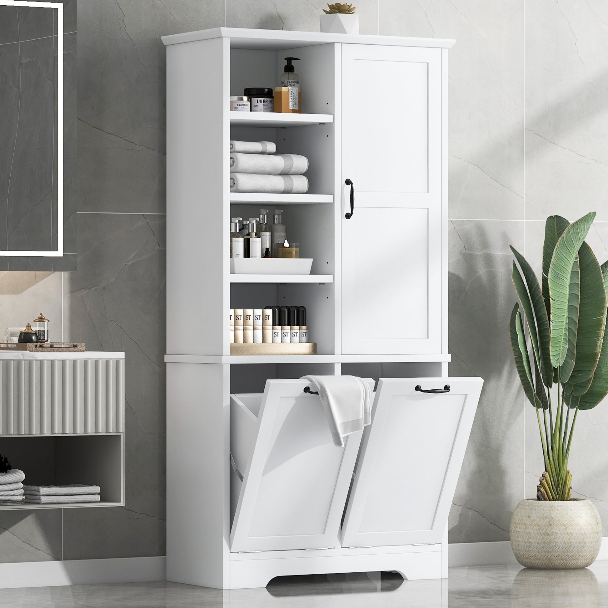 Bathroom Storage Cabinet with Doors and Drawers, Tilt-Out Laundry Hamper, Multiple Storage Space, Freestanding Style, Open Shelve, Adjustable Shelf, White