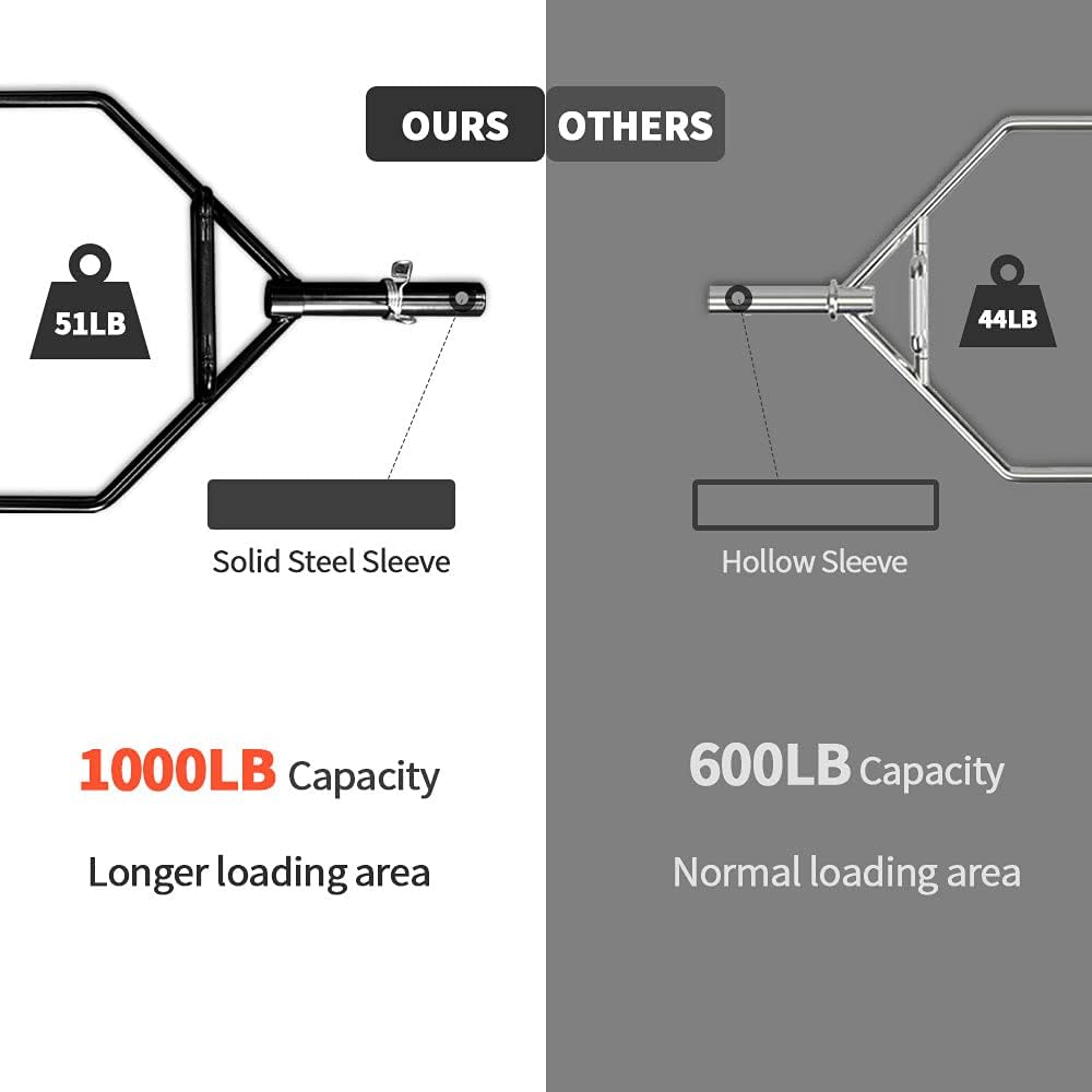 The hex bar of weighs is 55lbs, has a 1000 lb capacity ratingThe raised handles and hexagonal frame of the Hex bar allow for easier pick up from the ground and reduce the strain on your hands and back. Our hex bar weighs 55 lbs, has a 1000 lb capacity rating, and with 11.42 inch sleeves you can add plenty of additional weight to improve your strength and increase the intensity of your workouts. |