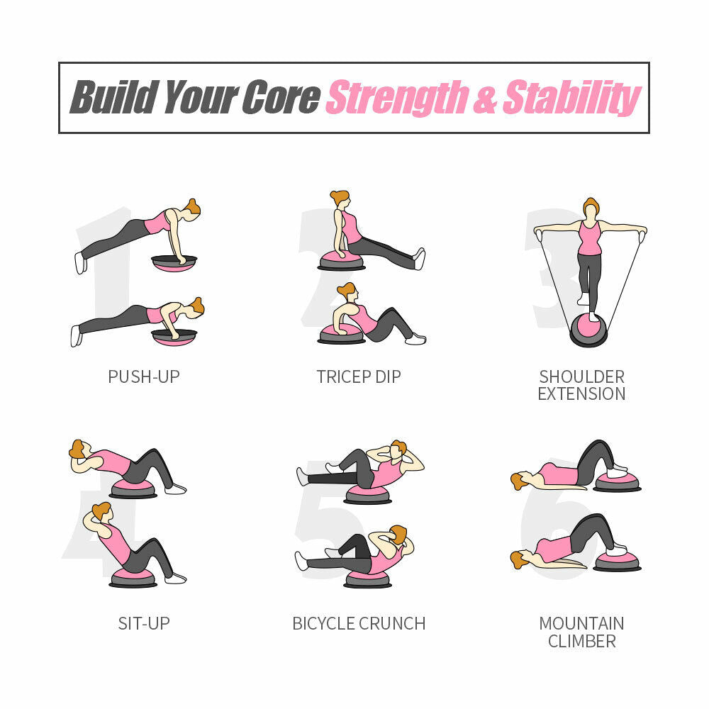 When the dome side faces up: unstable surface combined with stable device, suitable for athletic drills and aerobic activities.Ab Crunch, Bridge, Single Leg Balance, Side Lunge, Push Ups, Side Plank, Oblique Crunch, Lunges, Squat and more.