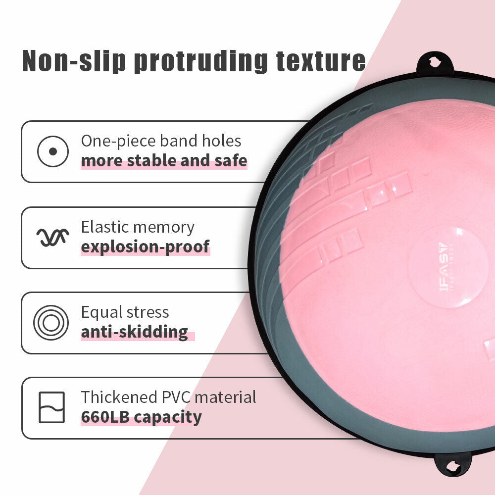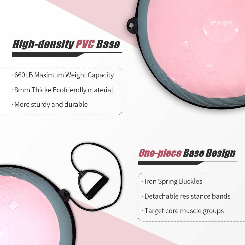 · Stylish & Portable Design: This half dome ball is combined with upgrade grey and romantic pink, which is absolutely the best exercise gear for your home workout and a great addition to your yoga practice. Comes with a complimentary foot pump, easy to inflate and deflate, which is convenient to store or carry wherever you want.